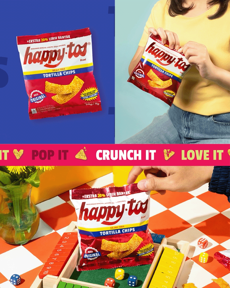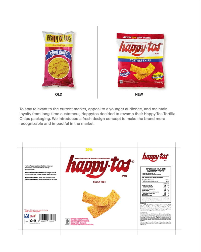 We approached Happytos with one goal: reintroduce the brand to a younger market without alienating its core fans. That meant creating a refreshed visual identity that felt bold, vibrant, and confidently local. Through deep category research, we redefined the role packaging played: not just as a container, but as a conversation starter. We created a flexible design system that could differentiate the product lines while still feeling cohesive under one brand world.